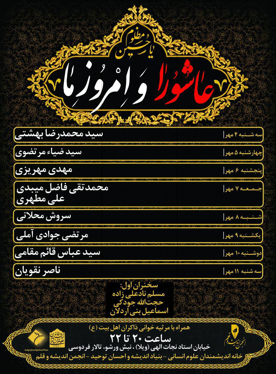 انجمن اندیشه و قلم با همکاری خانه اندیشمندان علوم انسانی و بنیاد اندیشه و احسان توحید این جلسات را از ساعت ۸ تا ۱۰ شب در محل خانه واقع در خیابان استاد نجت اللهی نبش ورشو برگزارمی کند و سفره احسان حضرت اباعبدالله الحسین (ع)نیز میزبان عزیزان می باشد