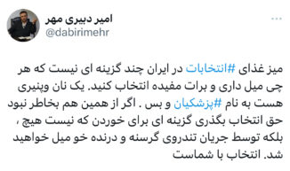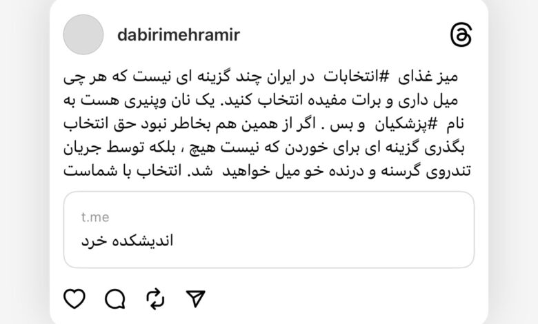 میز غذای #انتخابات در ایران چند گزینه ای نیست که هر چی میل داری و برات مفیده انتخاب کنید. یک نان وپنیری هست به نام #پزشکیان و بس . اگر از همین هم بخاطر نبود حق انتخاب بگذری گزینه ای برای خوردن که نیست هیچ ، بلکه توسط جریان تندروی گرسنه و درنده خو میل خواهید شد. انتخاب با شماست